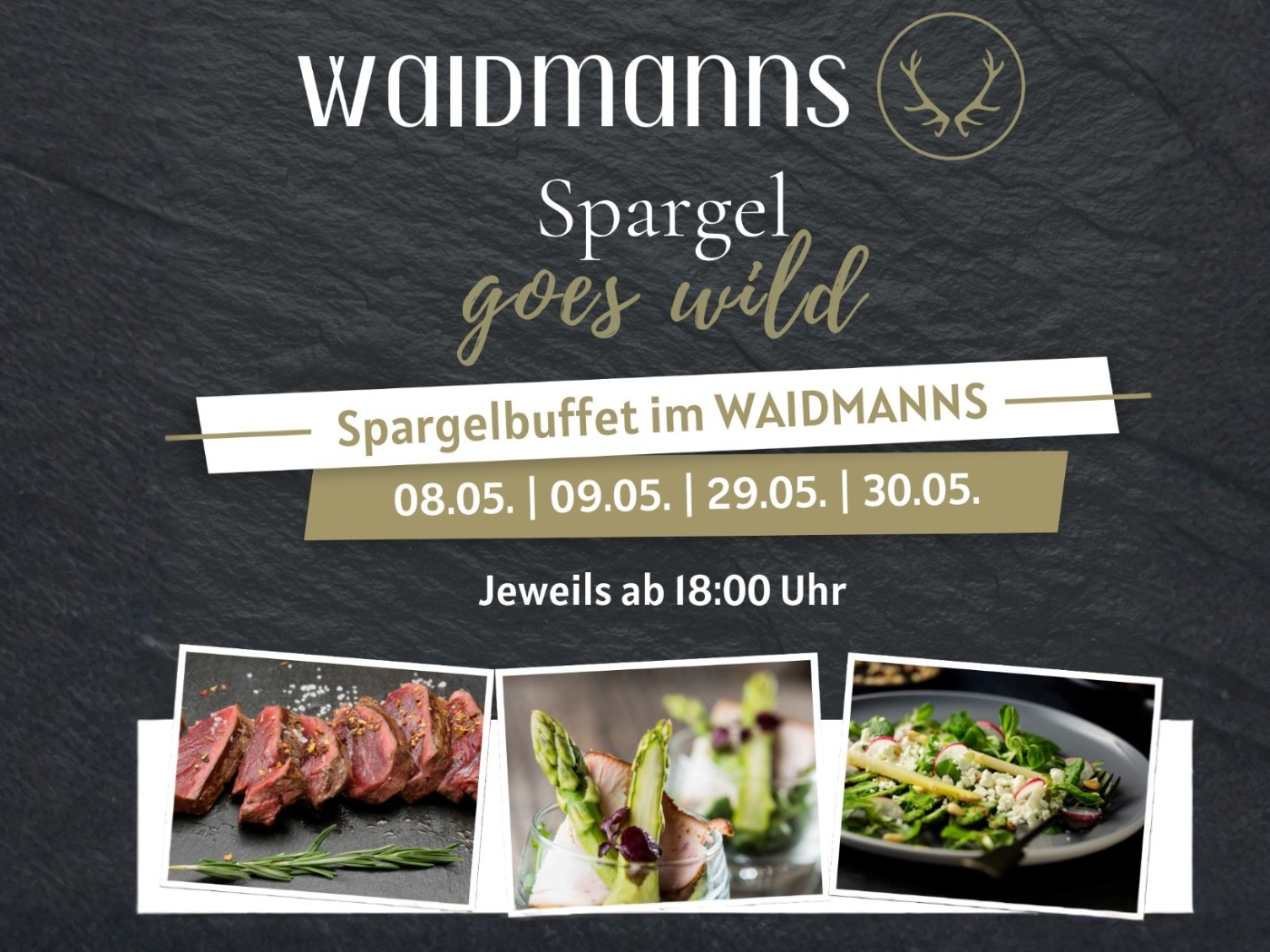 Genießt ein abwechslungsreiches Spargelbuffet mit kreativen Variationen, saisonalen Beilagen und feinen Fleischgerichten. Preis: 46,90 € pro Person.